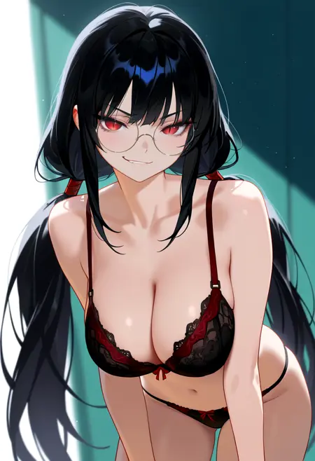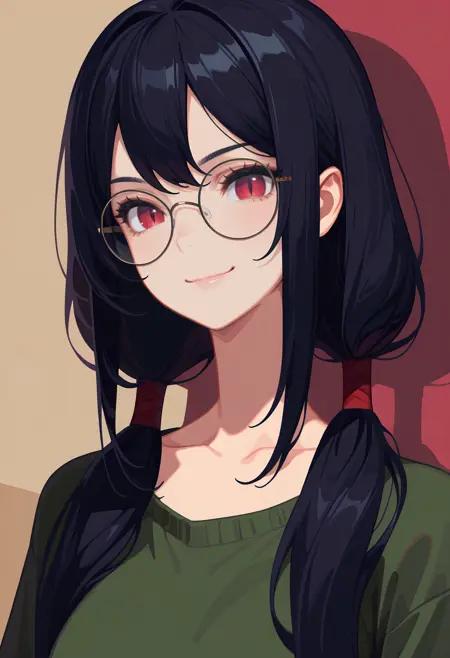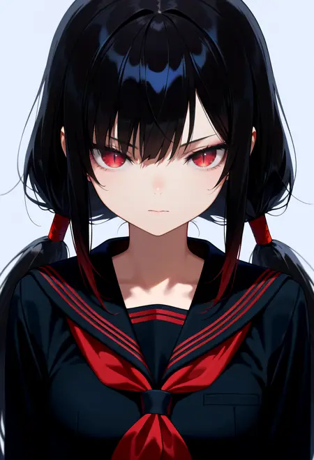 _black hair, red eyes, slit pupils, long hair, low twintails, hair tie,