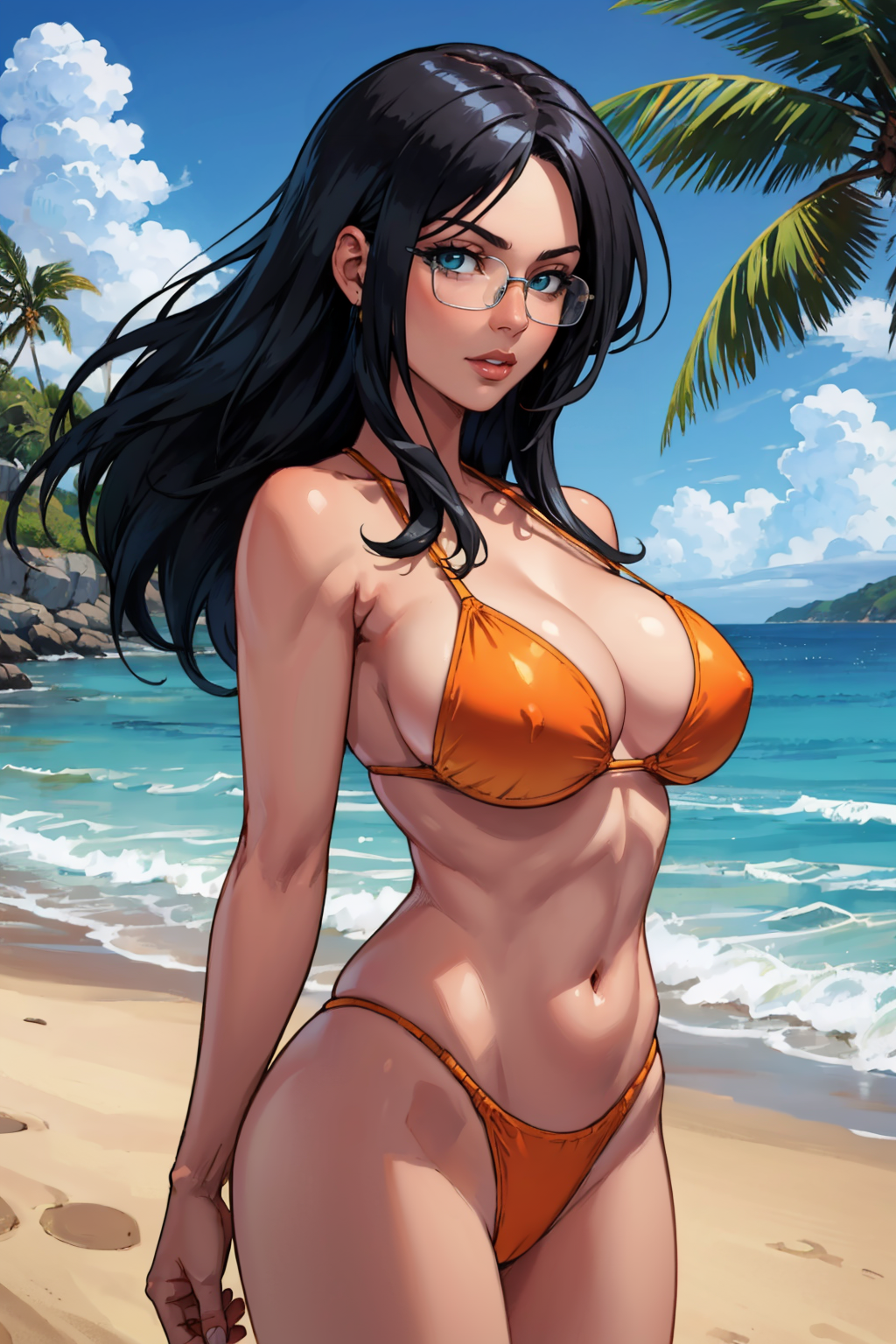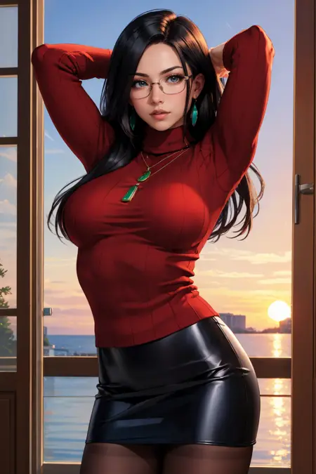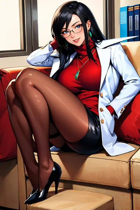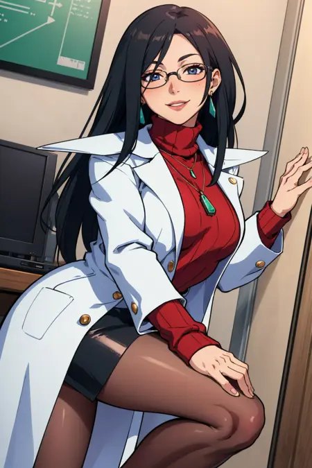 Add "glasses, earrings, necklace, red sweater, turtleneck, labcoat, black miniskirt, pantyhose, high heels" for her typical look.