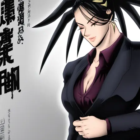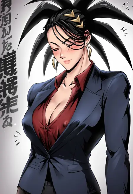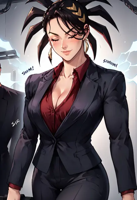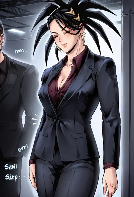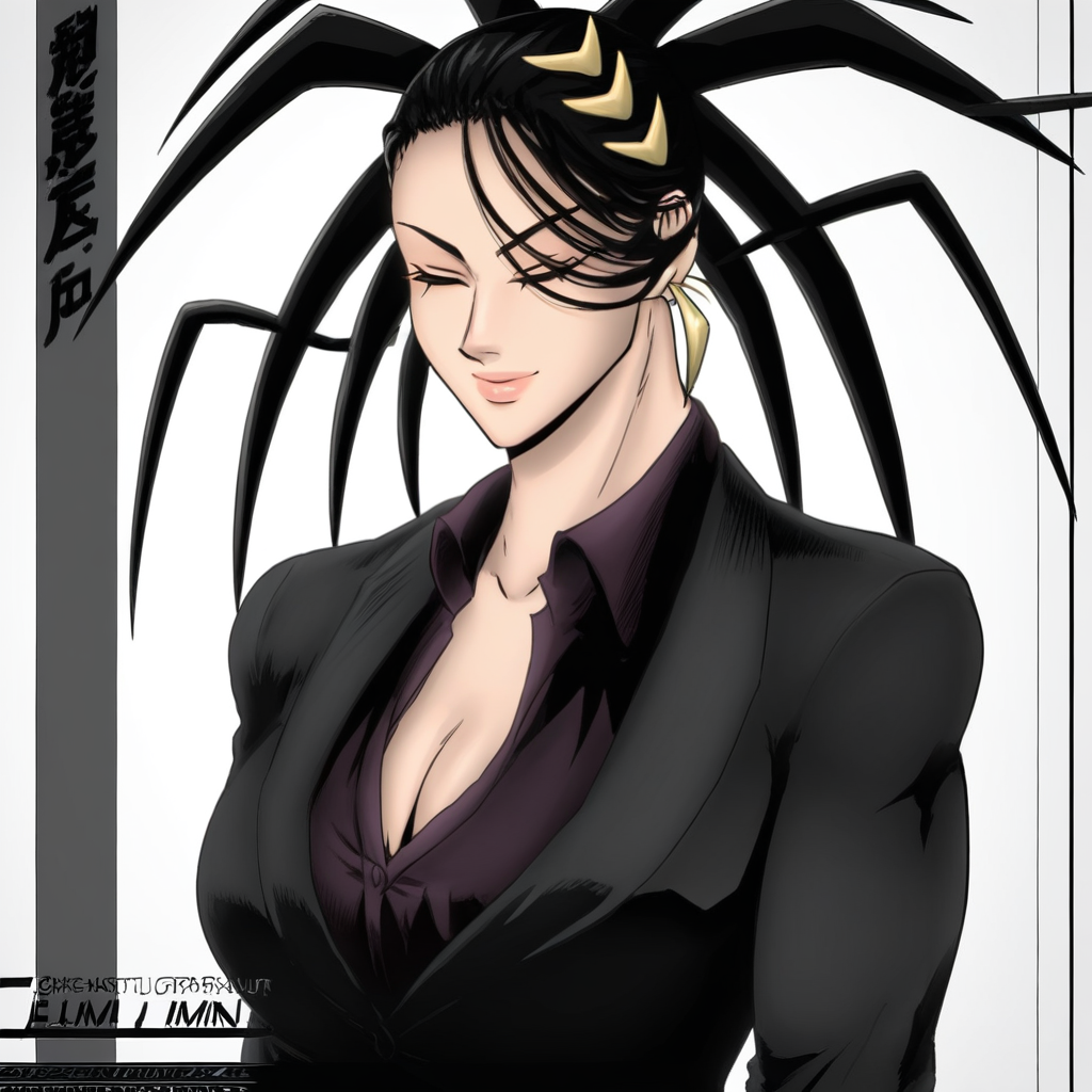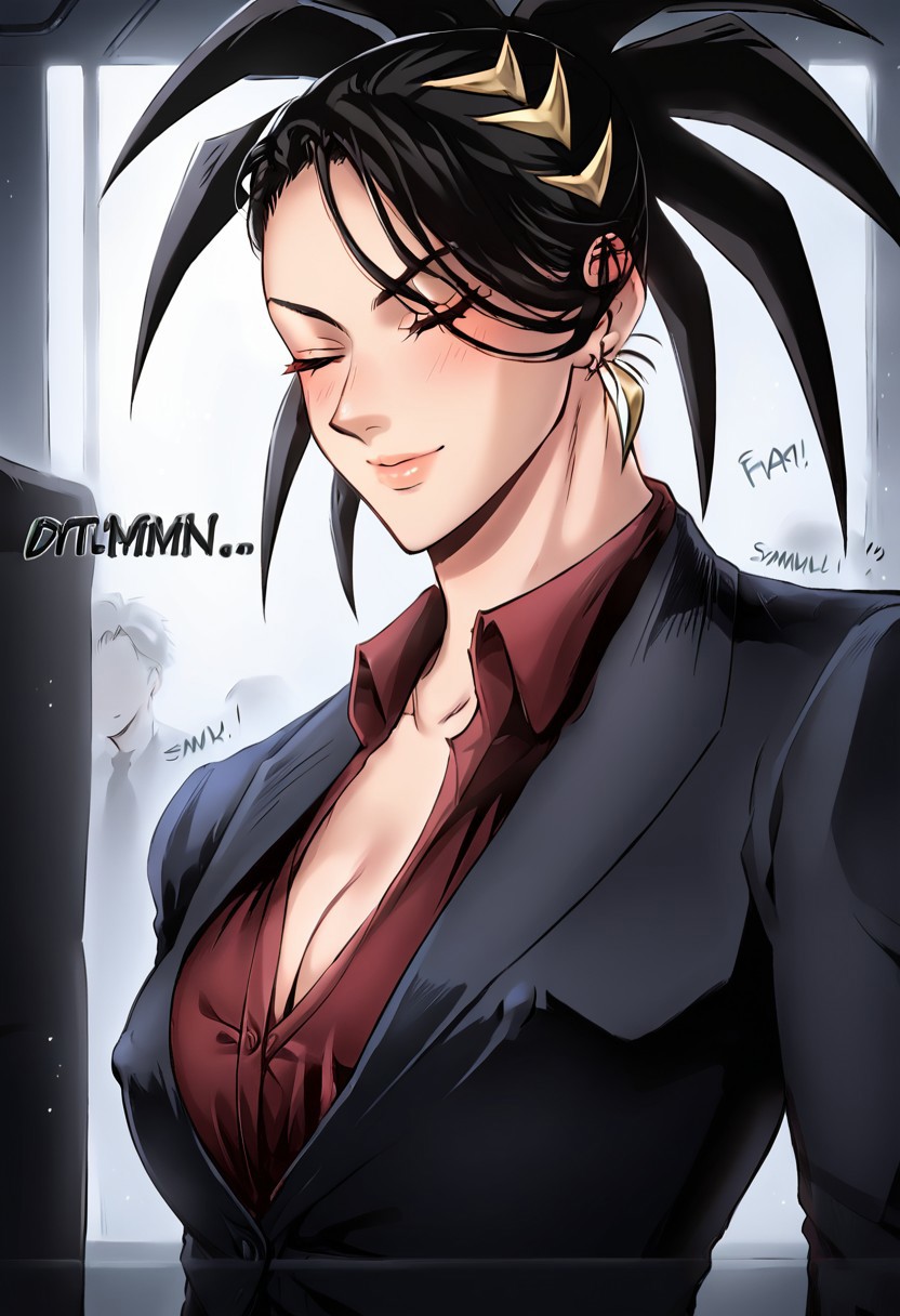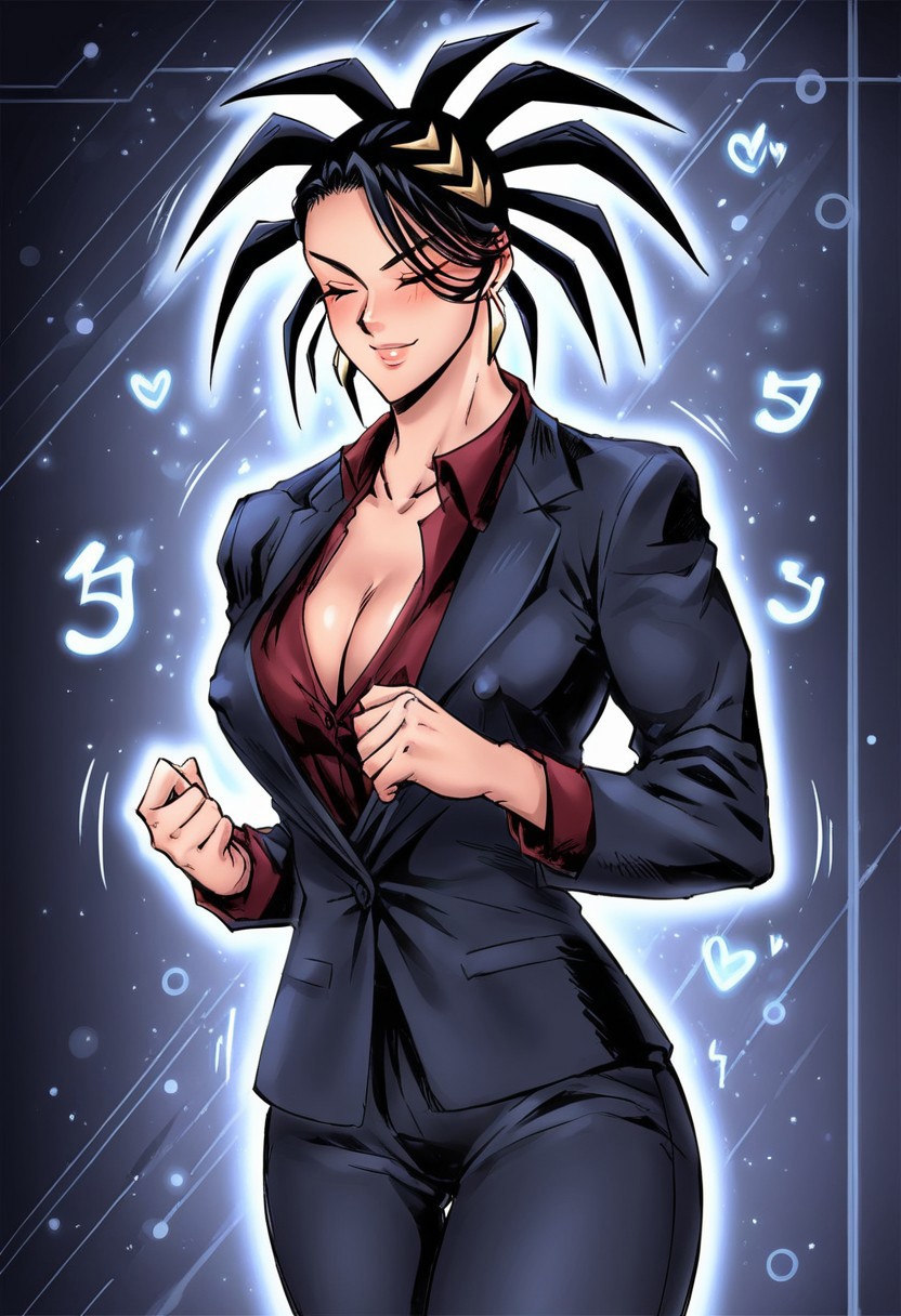 EliminOPM, 1소녀, 혼자, 사이보그, 근육질 여성, 긴 머리, 스타일링된 머리, 검은 머리, 머리 장식, 머리핀, 귀걸이, 닫힌 눈, 입술, 미소, 큰 가슴, 가슴 사이, 셔츠, 칼라, 검은 재킷, 검은 바지, 정장, 비즈니스 정장, 단추, 신발, 하이힐, 넓은 엉덩이, 꼭 맞는 바지, 셔츠 목선,