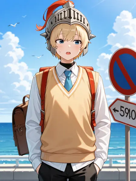 maleknight, solo, short hair, blonde hair, green eyes, armor, helmet, shoulder armor, gauntlets, pauldrons, breastplate, knight, plate armor