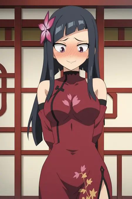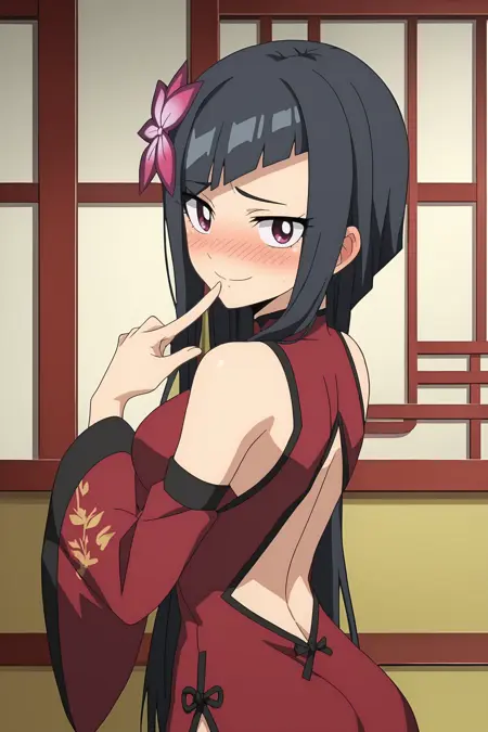 1girl, solo, long hair, breasts, black hair, hair ornament, purple eyes, hair flower, xiaomei