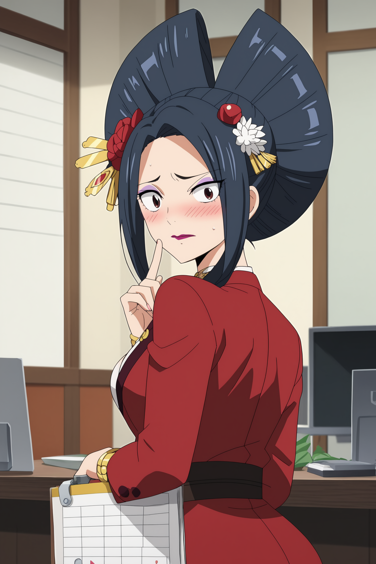 1girl, solo, breasts, black hair, hair ornament, brown eyes, jewelry, hair flower, makeup, lipstick, eyeshadow, kurenai_kogetsu