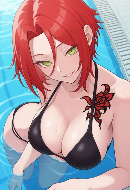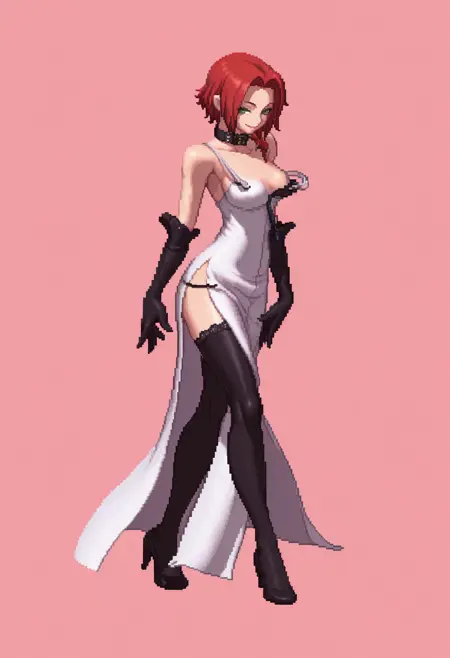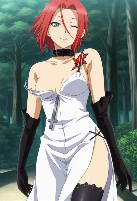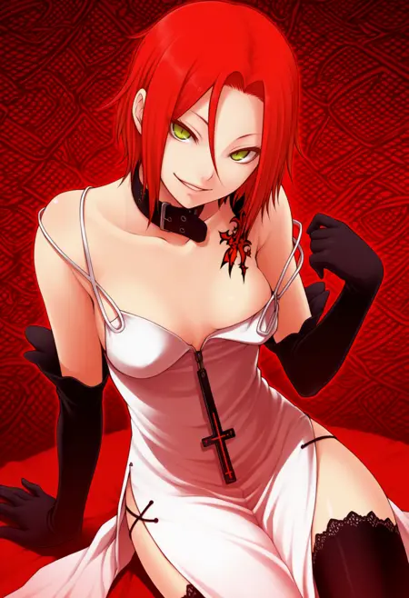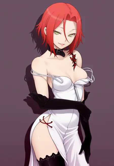 タグ:赤髪、緑の目、短い髪、タトゥー、白いドレス、肩紐ずれ、裸の肩、サイドスリット、肘まで手袋、黒い手袋、黒い太ももハイズ、十字架、首輪