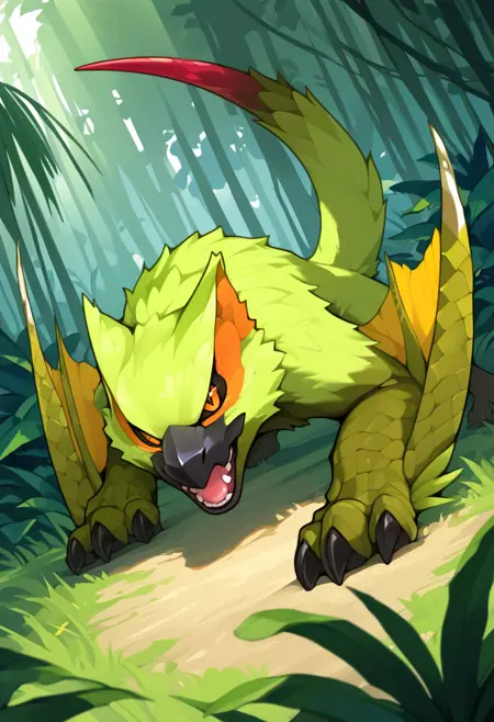 초록색 Nargacuga: 주황색 눈, 주황색 눈 무늬, 연한 녹색 털, 노란색 날개 달린 팔, 빨간색 꼬리 가시