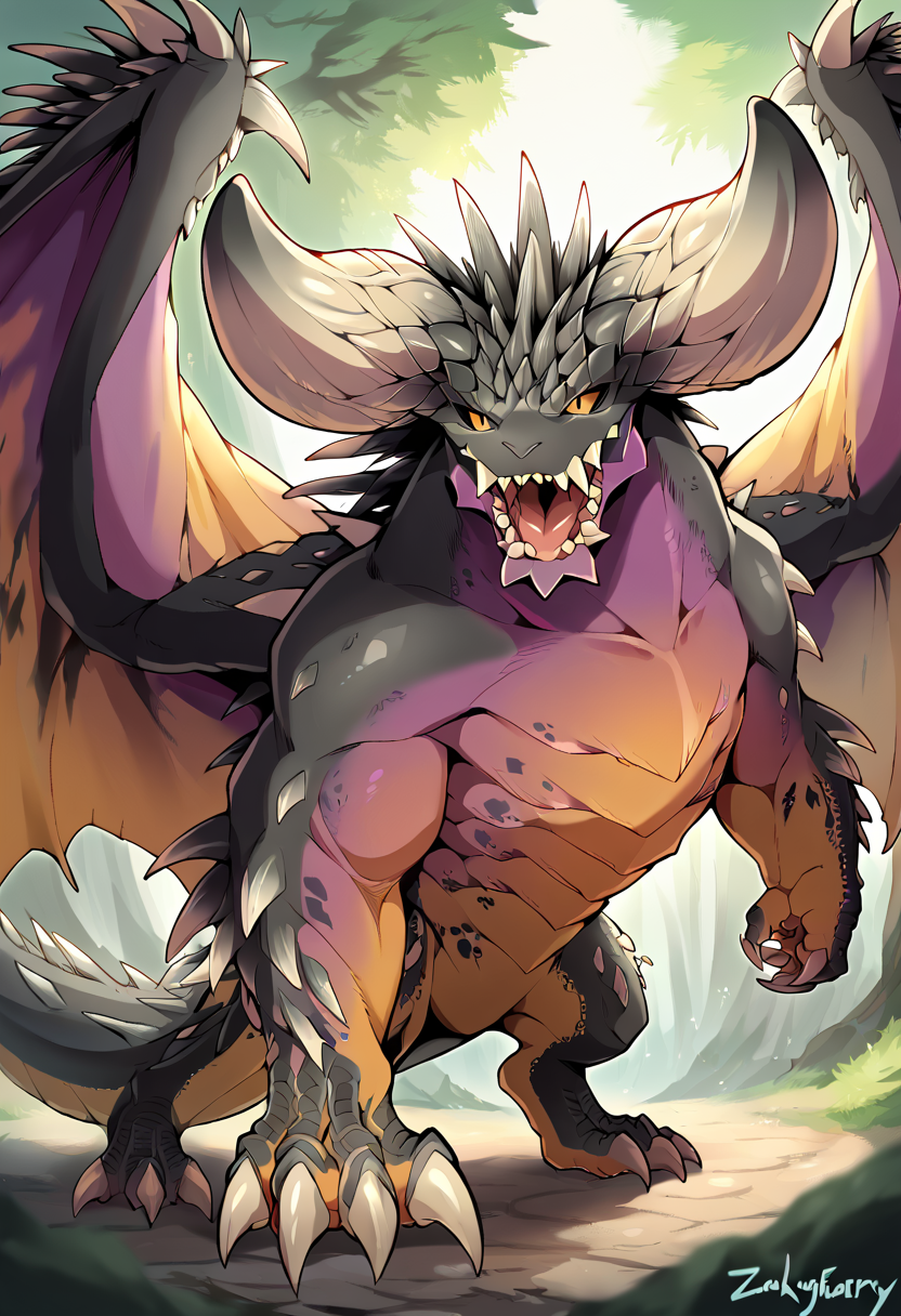 推荐正面标签:nergigante、角、尖刺、翅膀、黄眼睛、尾巴、爪子