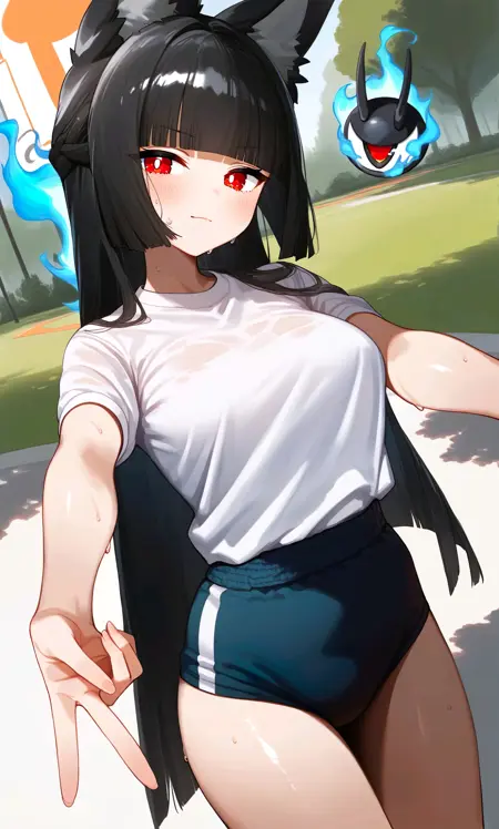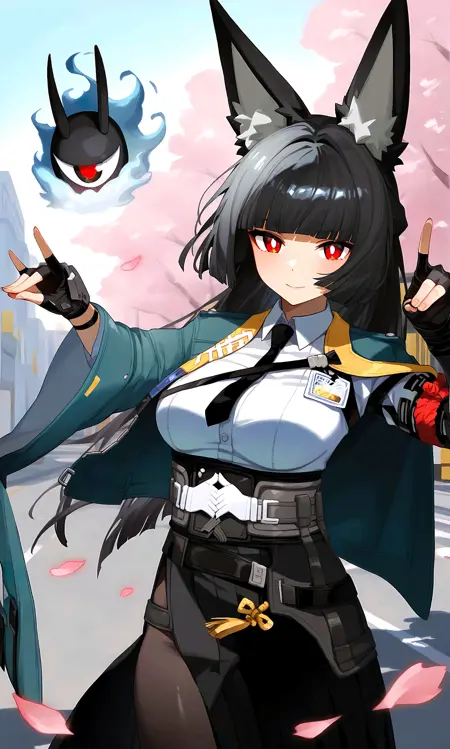 miyabi (zenless zone zero), red eyes, white pupils, black hair, very long hair, blunt bangs, fox ears, animal ear fluff