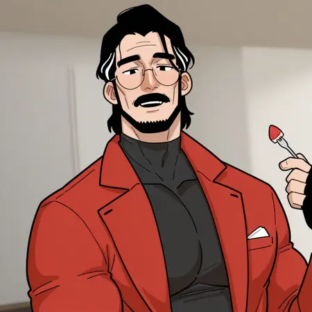 character: takahashi,1 mature man,medium hair,black and grey hair,two tone hair,side parted hair,mustache,chin curtain beard,black eyes