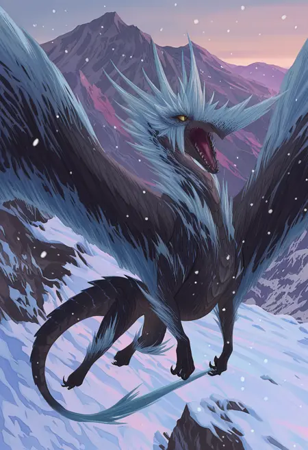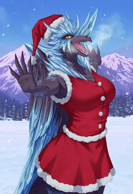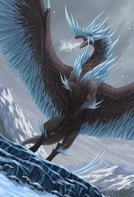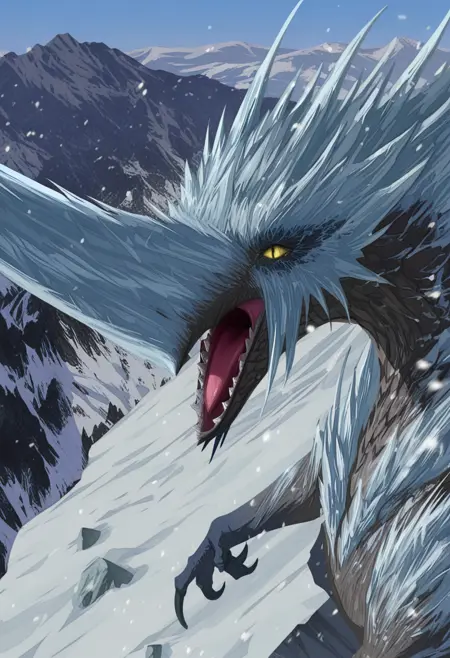 推荐正面词:velkhana,深灰色鳞片,浅蓝色点缀,冰发*,翅膀,