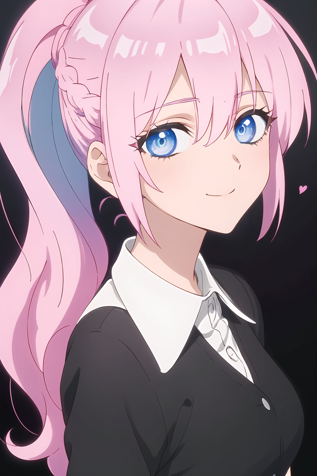 Trigger ponytail braid style : 1girl, pink hair, ponytail, long hair, blue eyes, braid, hair between eyes, bangs.