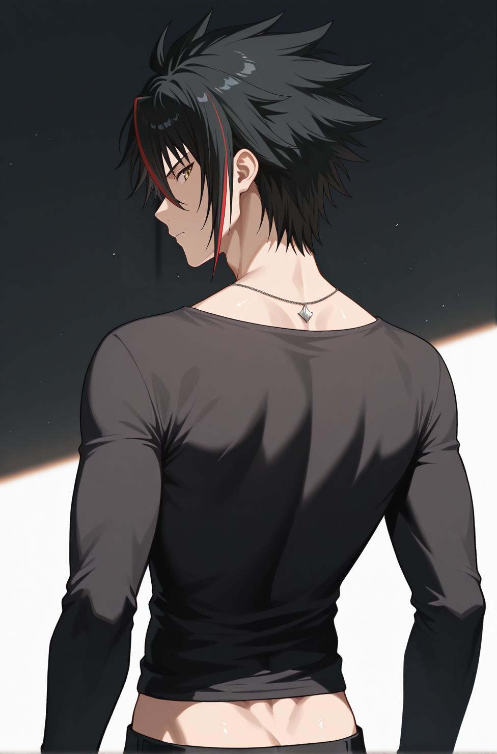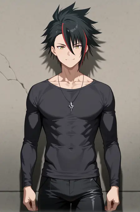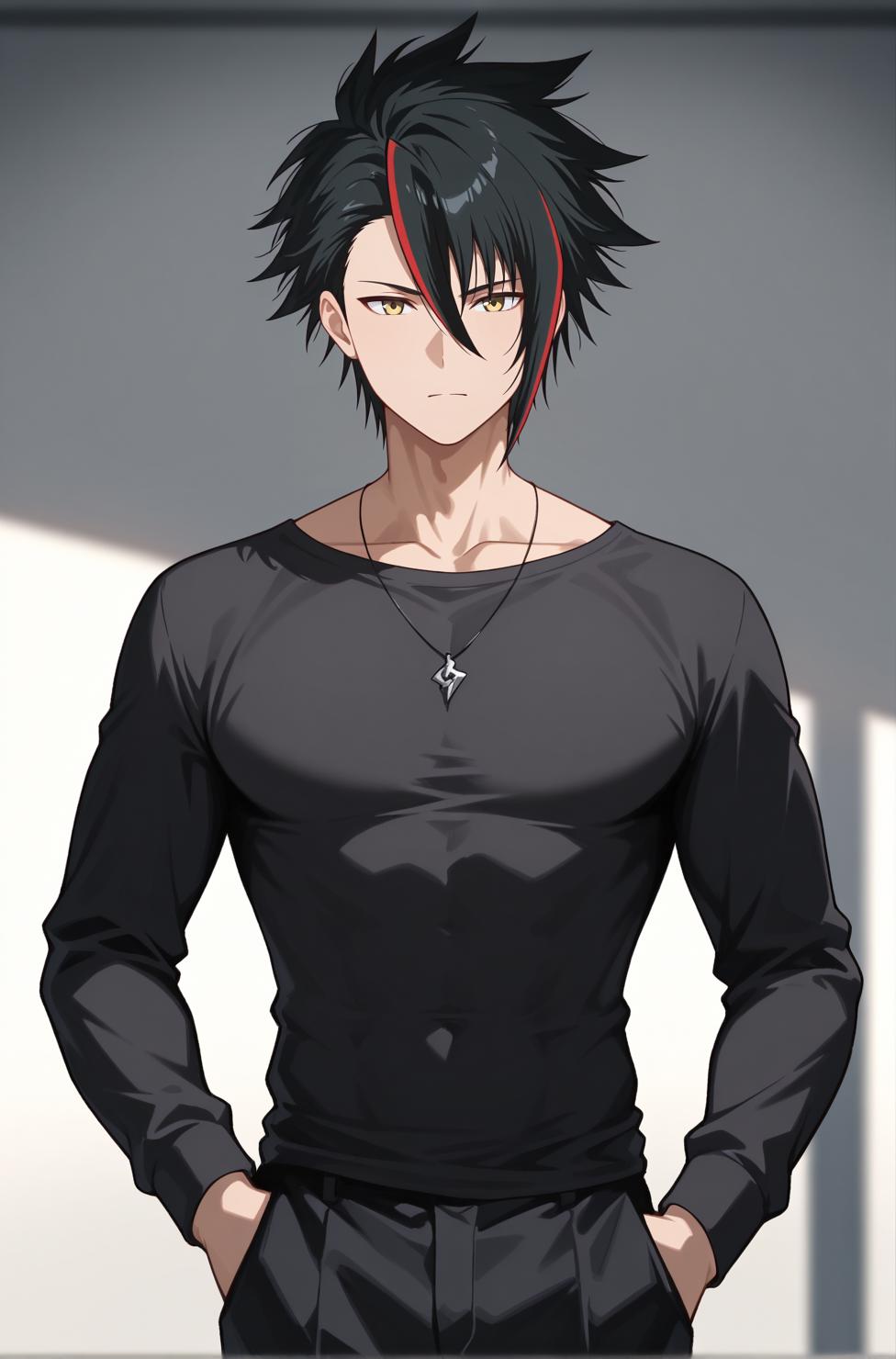 Prompt: ikusa, garai_ikusa, black hair, streaked hair, spiked hair, red hair, yellow eyes, hair between eyes