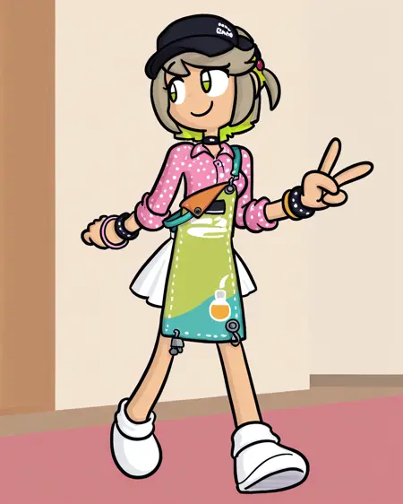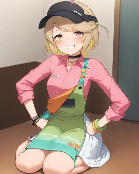 Use zzzcoco to summon her, for her default clothing, use black choker, visor cap, polka dot shirt, pink shirt, long sleeves, bracelet, apron, white skirt