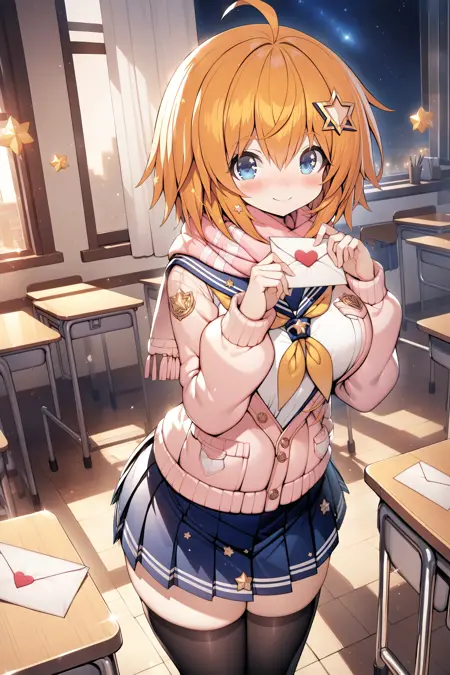 school: セーラー服、セーラー襟、長袖、薄ピンクのジャケット、ピンクのスカーフ、黄色いネクタイ、青いスカート、プリーツスカート、ブラックのスリーブレッグ、rofar