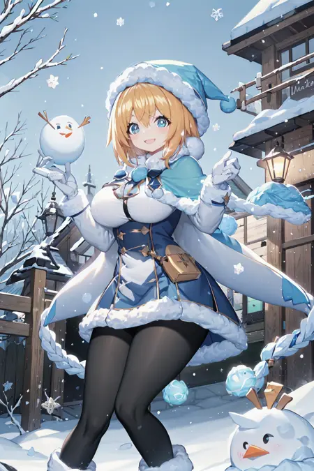 winter: blue hat, winter clothes, long sleeves, fur-trimmed capelet, blue capelet, white gloves, black pantyhose, lace-up boots