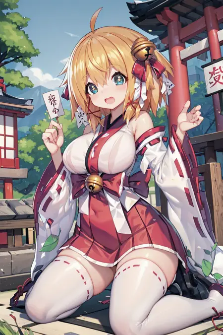 miko: hair ornament, hair ribbon, japanese_clothes, miko, wide_sleeves, white_thighhighs, bell, ribbon_trim, jingle_bell, hair_bell, ribbon-trimmed_legwear, waraji
