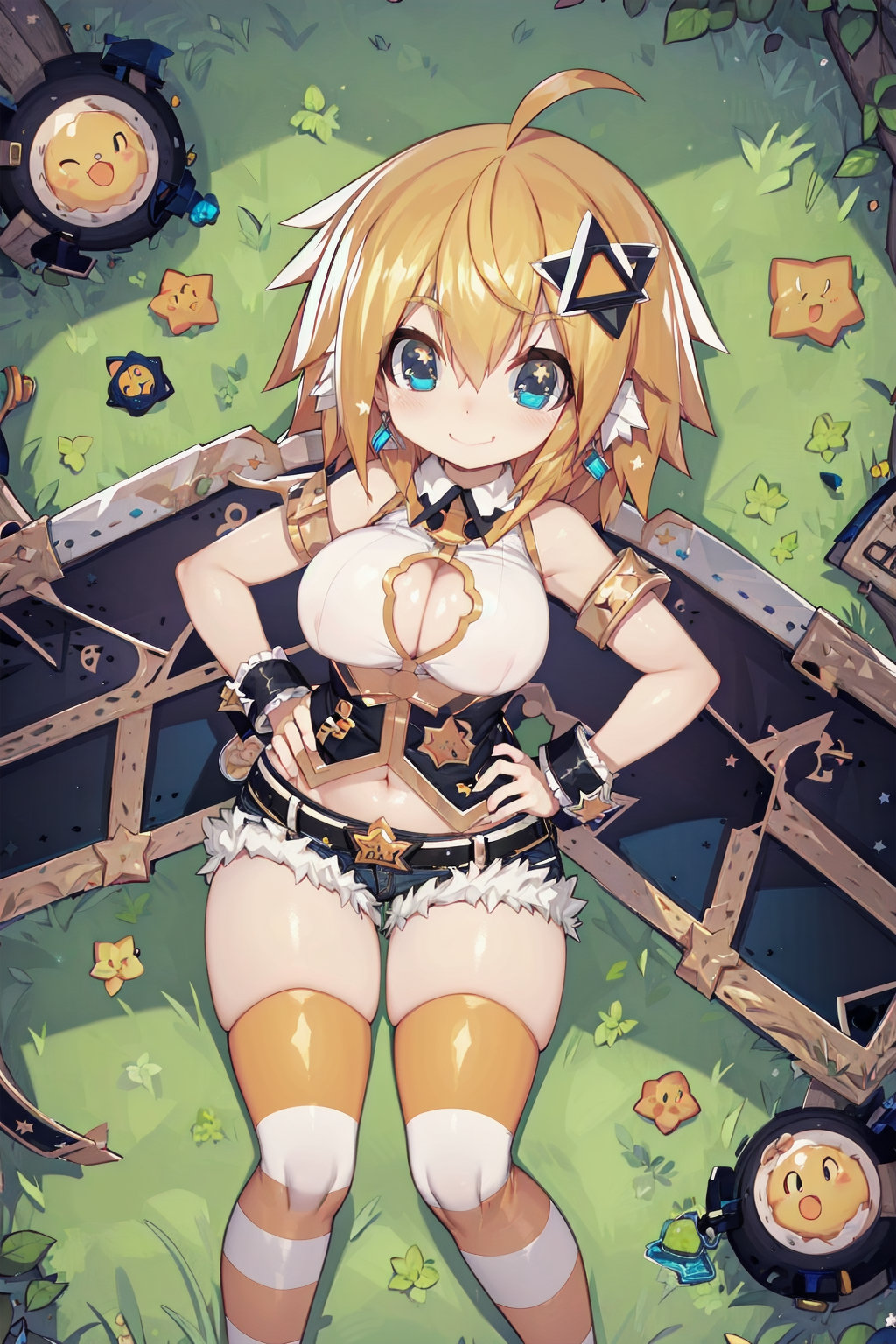 def-a: earrings, white shirt, bare shoulders, cleavage cutout, navel, denim, short shorts, fur-trimmed shorts, belt, wrist cuffs, striped_thighhighs, jewelry