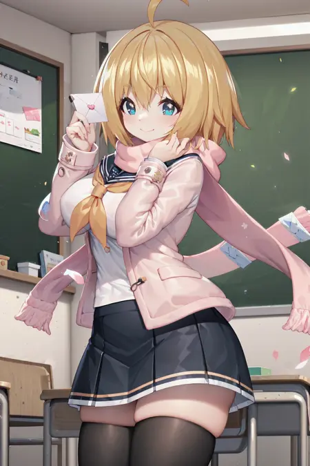 school: serafuku, sailor collar, long sleeves, pale pink jacket, pink scarf, yellow neckerchief, blue skirt, pleated skirt, black thighhighs, rofar