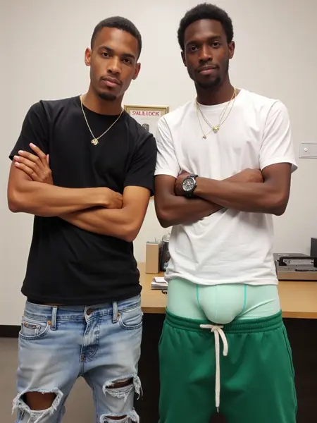 “右侧的人物穿着蓝色牛仔裤和黑色连帽衫,而另一人则穿着下垂的深灰色运动裤,并露出亮绿色内裤。”
