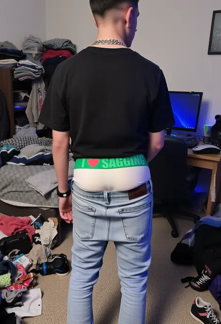 “一张正面拍摄的年轻女性照片。她身穿黑色上衣和下垂的黑色牛仔裤,露出白色内裤,腰带上印有黄色文字‘I ❤️ SAGGING’。”