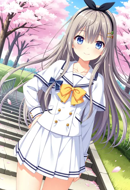 ユニフォーム: Arisu, Uniform Arisu, very long hair, grey hair, blue eyes, bangs, hair between eyes, hairclip, heart hairclip, blue_hairband, hair ornament, school uniform, long sleeves, white uniform, dark_blue_low_hair_bow, sailor uniform, white sailor collar, blue trim, double-breasted uniform, gold buttons, white skirt, pleated skirt, white thighhighs, light_blue_bow_thighhighs, (yellow_chest_ribbon:1.3), (blue_back_bow:1.3)