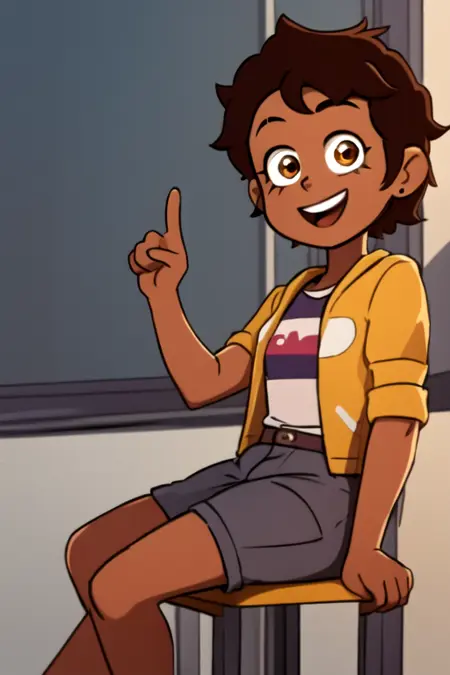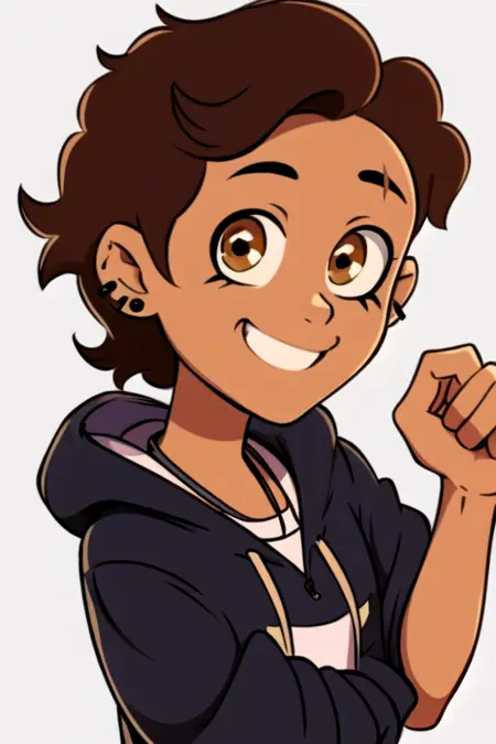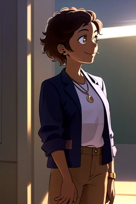 luz_timeskip, brown eyes, brown hair, short hair, earrings, jewelry, dark skin