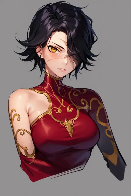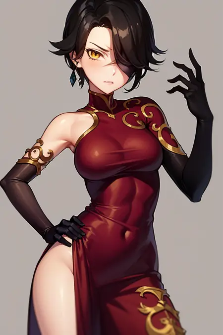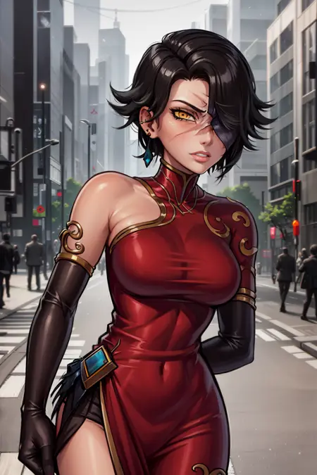 Mistral衣装プロンプト:cindermistral、片方の目に髪がかかる、赤いチャイナドレス、肘グローブ、傷、顔の傷