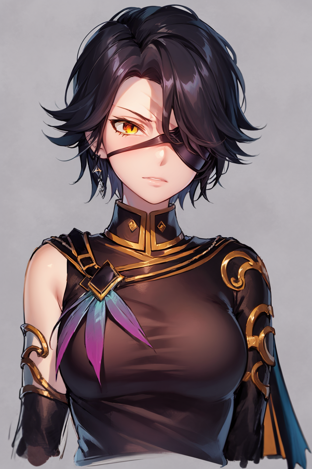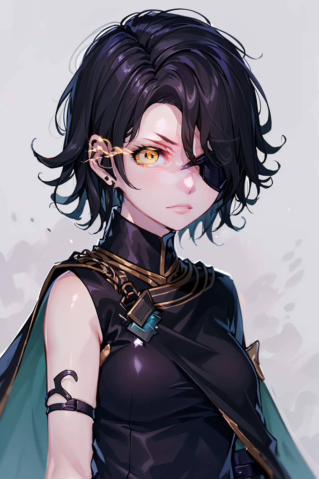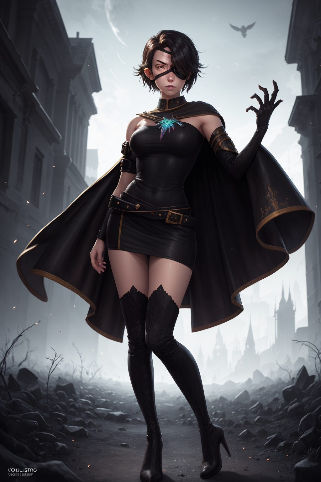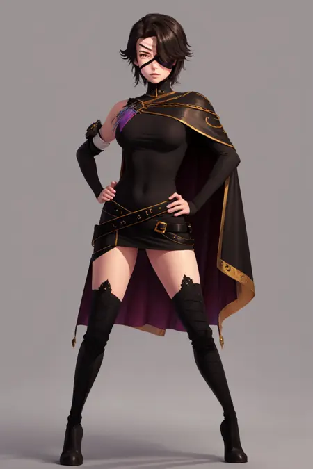 Atlas衣装プロンプト:cinderatlas、アイパッチ、黒いマント、短い、太ももブーツ