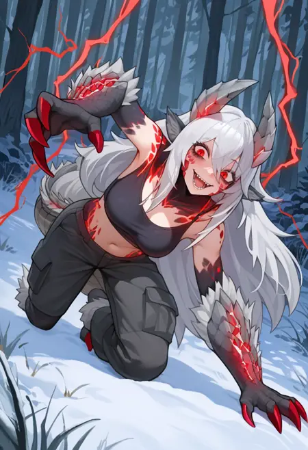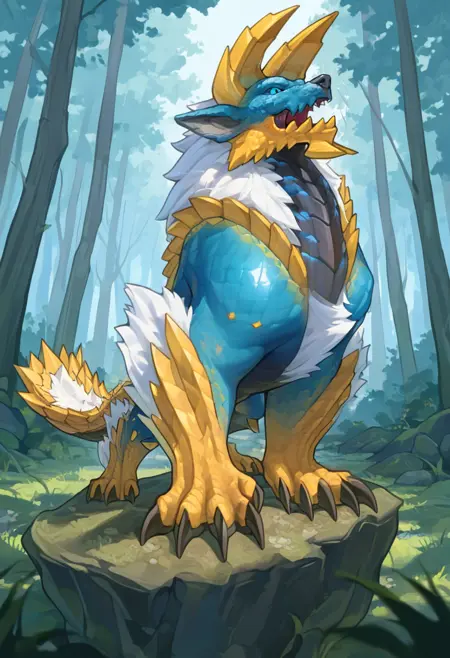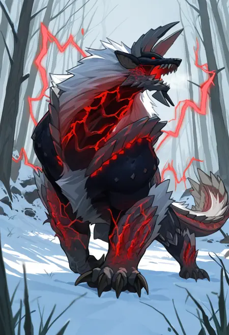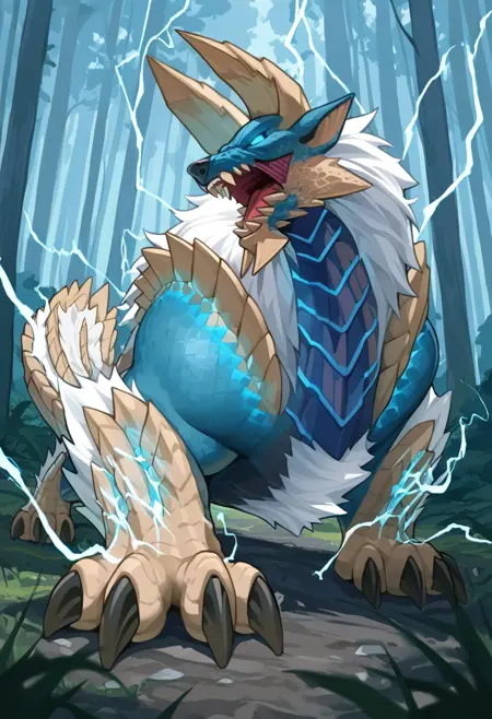 推奨ポジティブ: zinogre, scalie, horns, claws, tail, glowing accents*, lighting*,