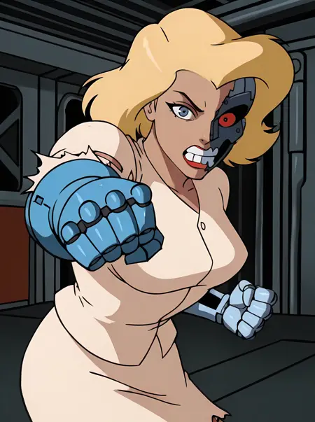 랜다는 애니메이션 시리즈 '배트맨: 애니메이티드 시리즈'의 2부작 에피소드 "Heart of Steel"에 등장하는 "복제인"입니다(인간을 모방하고 대체하도록 설계된 로봇). 이 LoRA에는 에피소드에서 그녀가 입었던 두 벌의 옷이 모두 포함되어 있습니다. 또한, 에피소드 클라이맥스에서 한 팔과 얼굴의 절반은 타버려 그 아래 터미네이터처럼 보이는 로봇 골격이 드러나는 '전투 손상' 외모도 재현할 수 있습니다.