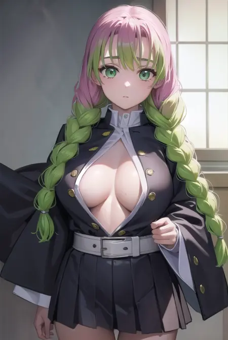 mitsuri kanroji,发辫,渐变发色,(绿色眼睛:1.5),绿发,长发,痣,眼下痣,多色发,粉发,双辫,双色发,