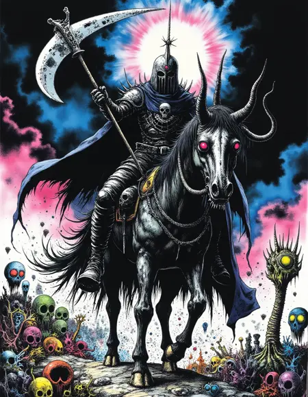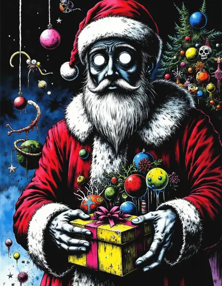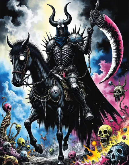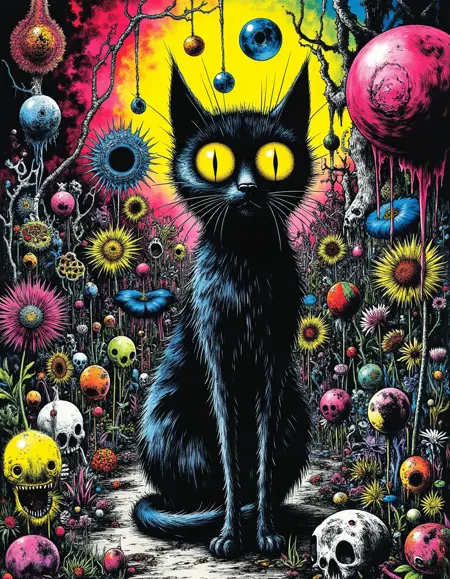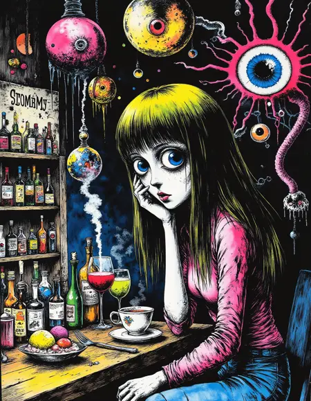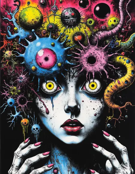 "Crazy Horror" combines elements of graphic novel art with a high-contrast, psychedelic horror aesthetic. The lines are bold and detailed, often giving the scene an intense, almost claustrophobic feeling. The use of bright, contrasting colors—especially in the elements of horror—such as glowing eyes and strange, surreal forms, adds to the unsettling, trippy vibe of the artwork. There is a strong emphasis on exaggerated features and disjointed, nightmarish imagery, while still maintaining a clear, almost sketch-like style. The texture is gritty, with a blend of dark tones and neon highlights that evoke a sense of chaos and madness, typical of horror-themed art with a surreal, graphic intensity.