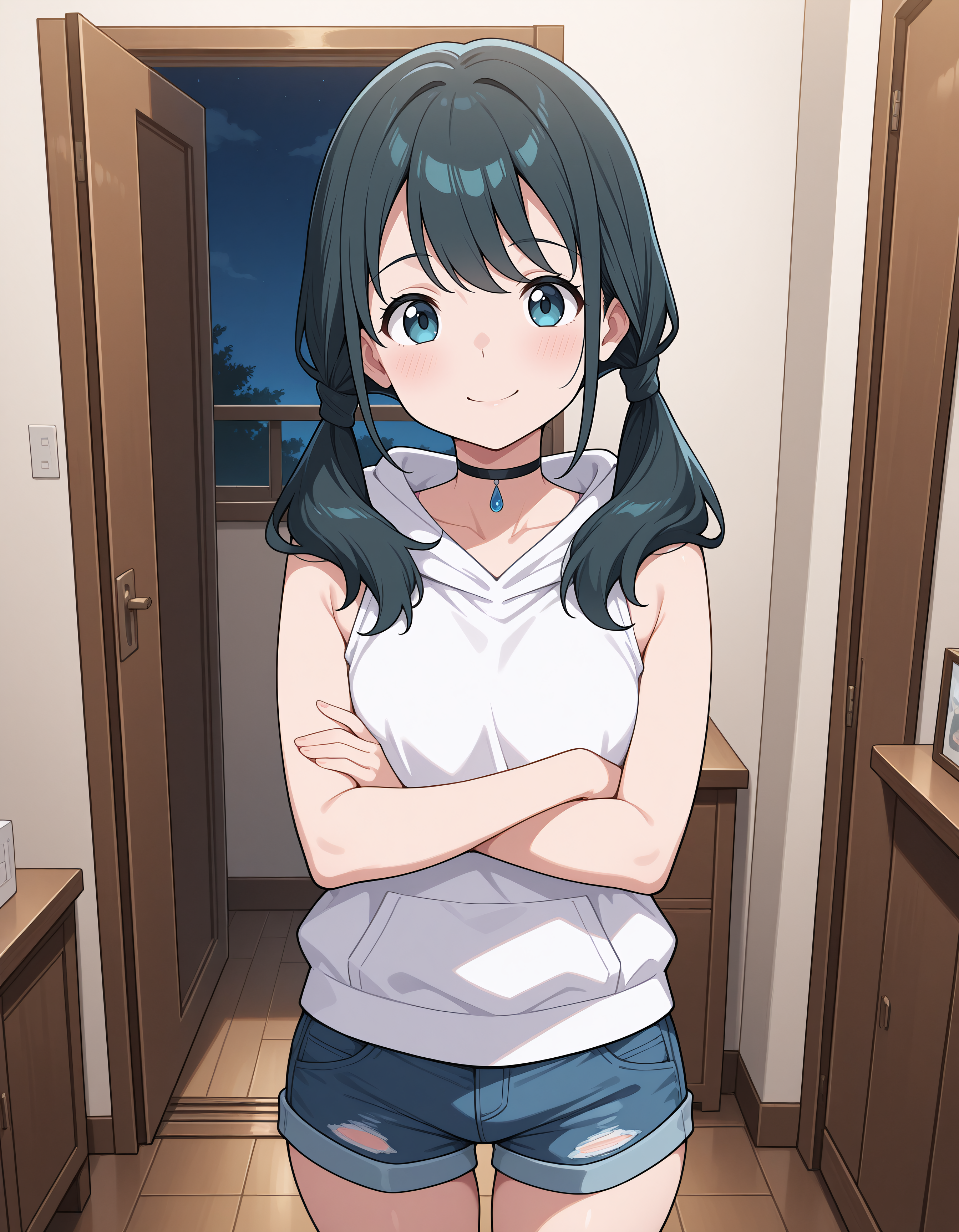 hina_amano_\(weathering_with_you\), 검은 머리, 중간 길이 머리, 낮은 트윈테일, 파란 눈, 검은 목걸이, 흰색 소매 없는 후드티, 분홍색 소매 없는 셔츠, 청바지 반바지, 아쿠아 앵클 양말