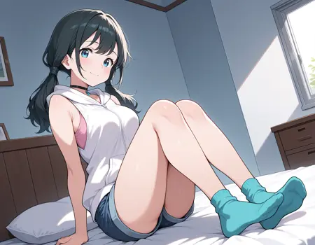 hina_amano_\(weathering_with_you\), black hair, medium hair, low twintails, blue eyes, black choker, white sleeveless hoodie, pink sleeveless shirt, denim shorts, aqua ankle socks