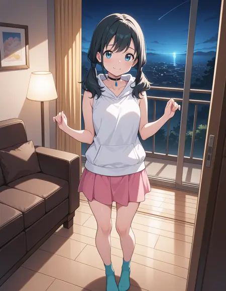 『天気の子』の天野陽菜。現時点では、ノースリーブのフーディーを着た彼女のデフォルト衣装のみを含み、デニムショートパンツまたはピンクのスカートの両方に対応しています。LoRAは服を自由に変更できるほど柔軟です。
