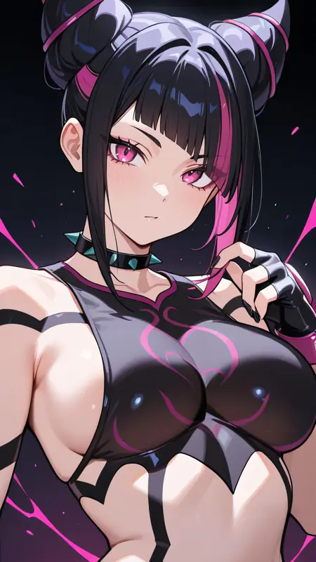 Tags: jurisf, 1girl, solo, breasts, spiked color, fingerless gloves, bangs, hair horns,