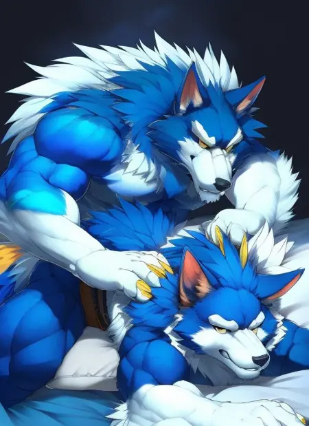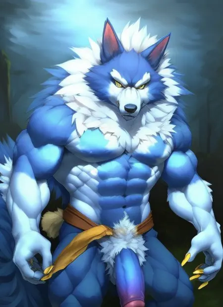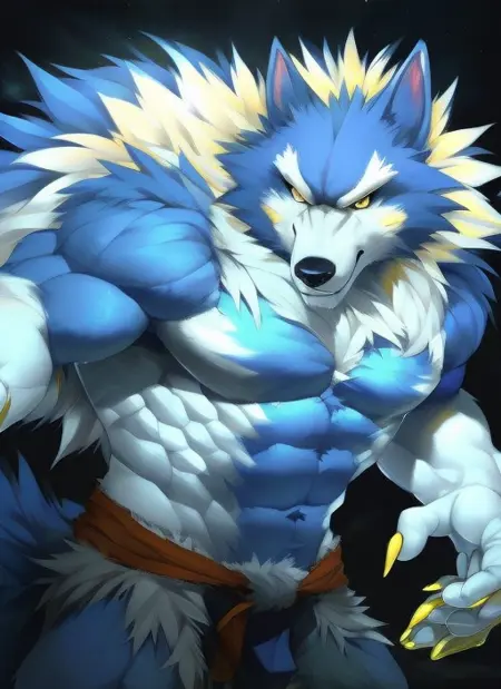 ((写实的)), 上传至e621, gallon, 狼, 蓝色皮肤, darkgem, 獸人, 男性, (((细致蓬松的毛发))), (((二头肌发达的))), (((有阴影的))) 极高细节, 无上衣男性, 人狼, 狼男孩, 黄色腰带, 黄色眼睛, 黄色指甲