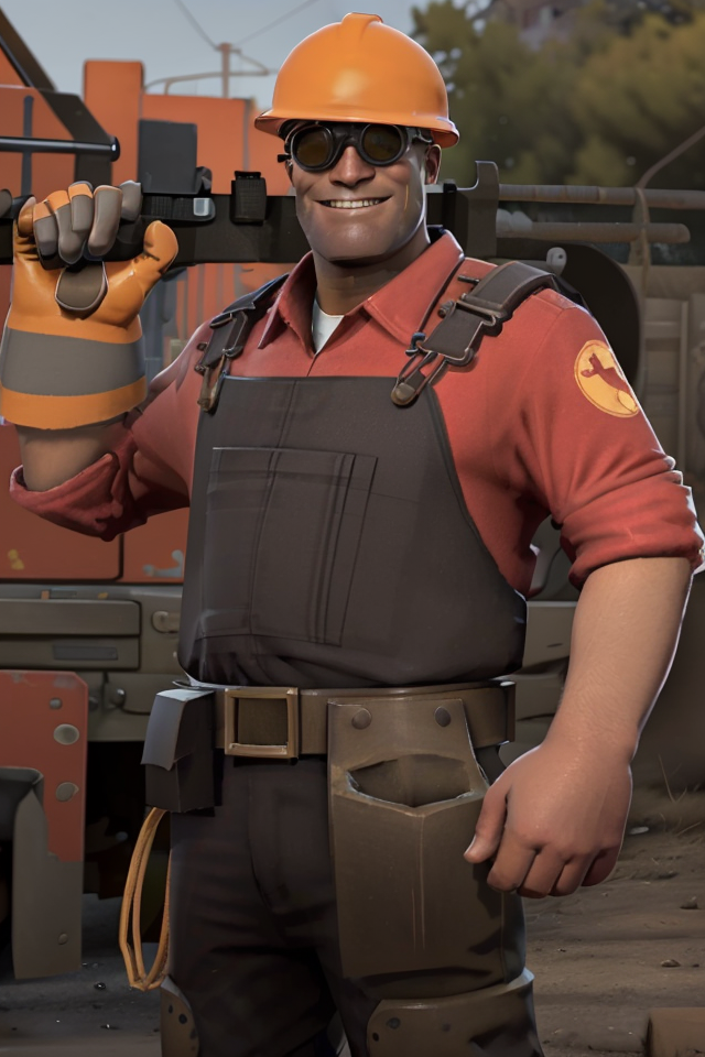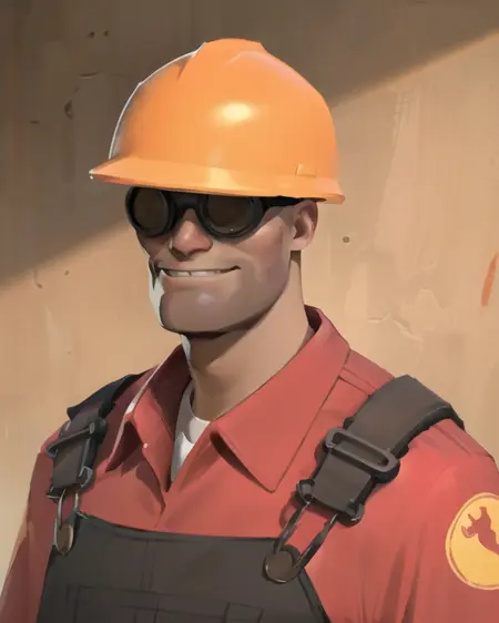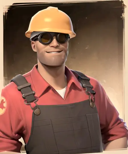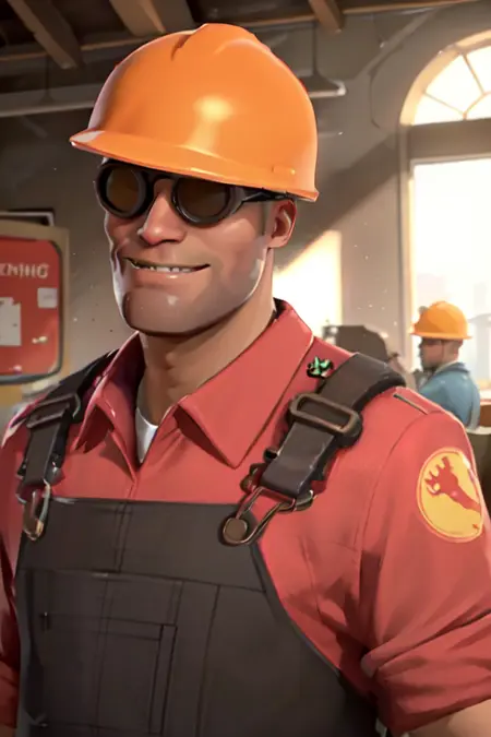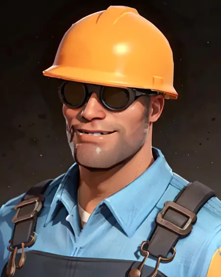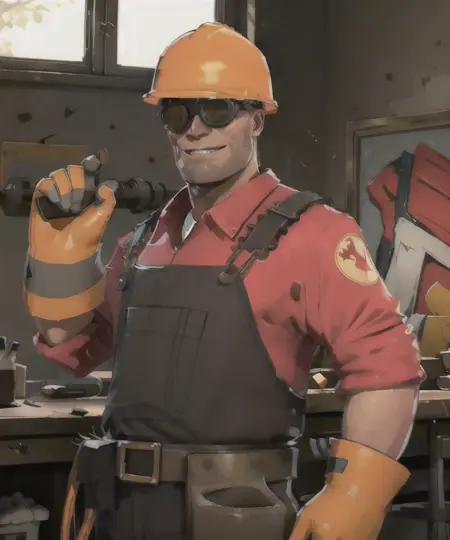 goggles, hardhat, overalls, red/blue shirt, single glove on prompts helps