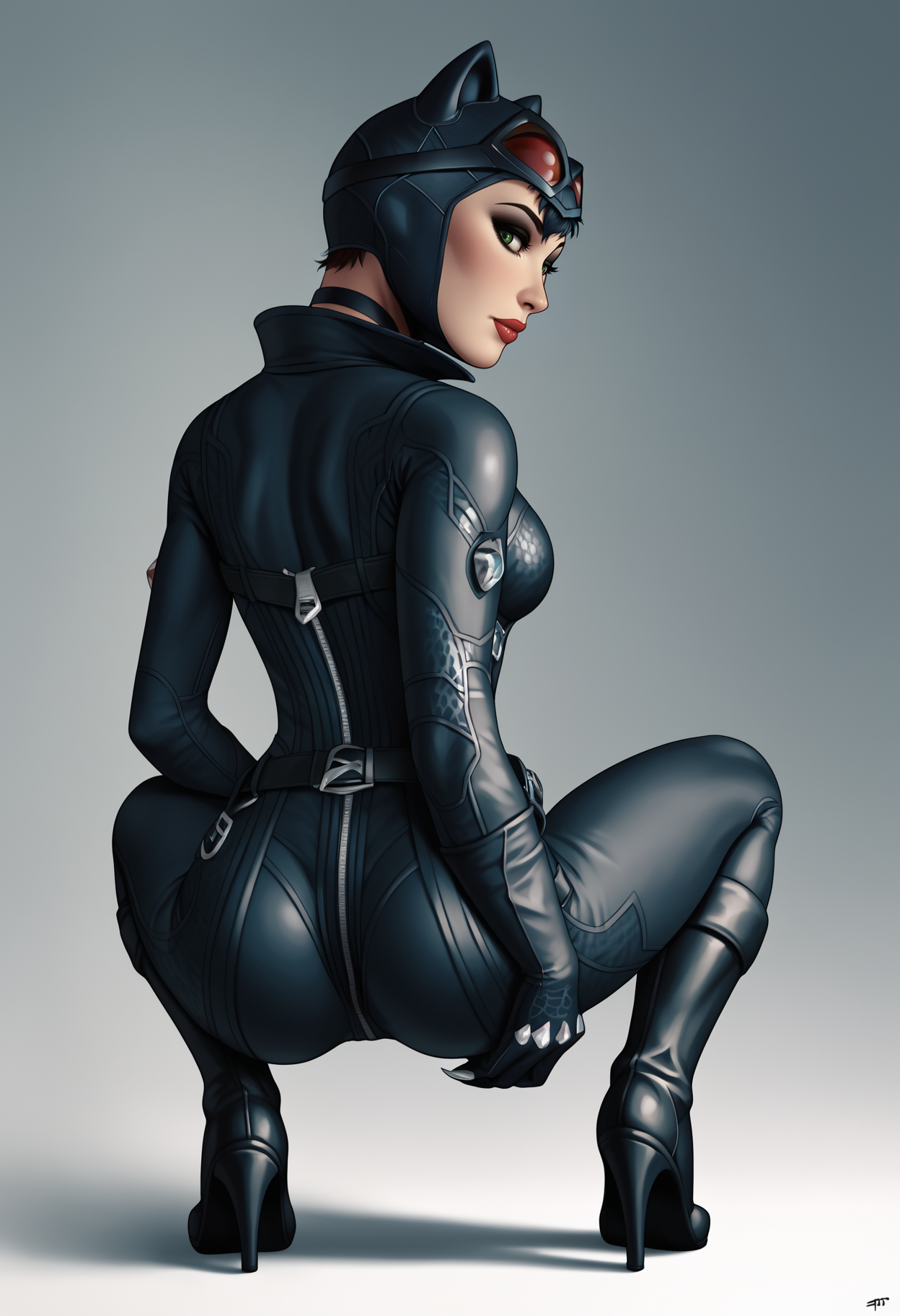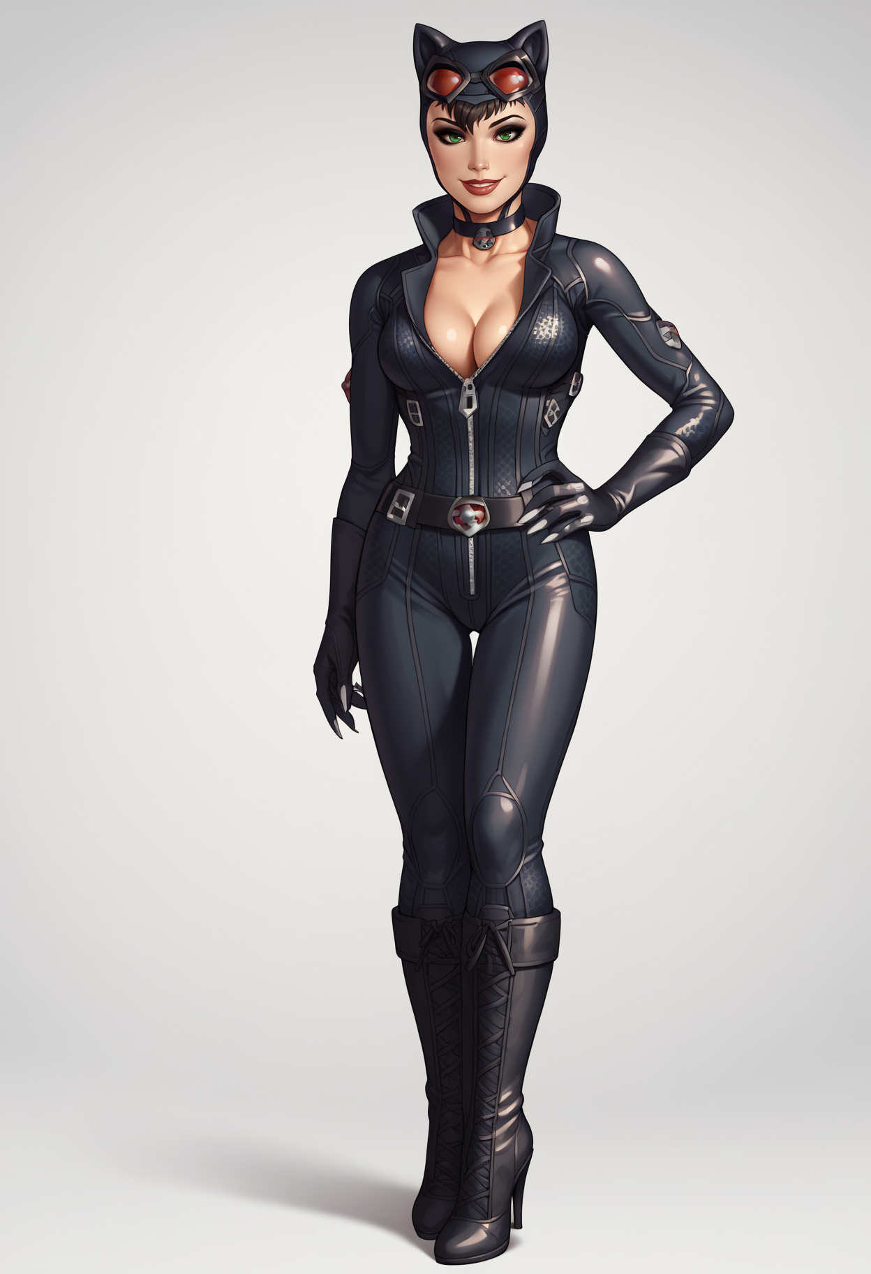 Basic prompts : 1girl, catwoman, green eyes, makeup, short hair, cat ears, goggles on head