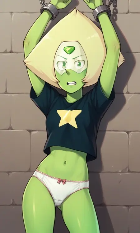 1girl, colored skin(green skin), peridot,green eyes, Bob cut, blonde hair,multicolored clothes,green bodysuit, forehead jewel