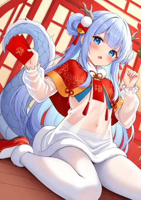 longwu, 파란 눈, 얼굴 홍조, 긴 머리, 파란 머리, 앞머리, 용 꼬리, 털장식이 달린 꼬리,