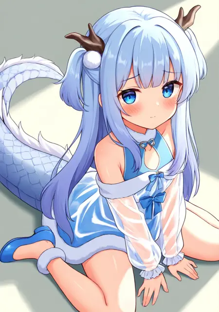 longwu, blue eyes, blush, long hair, blue hair, bangs, dragon tail, tail with fur trim,