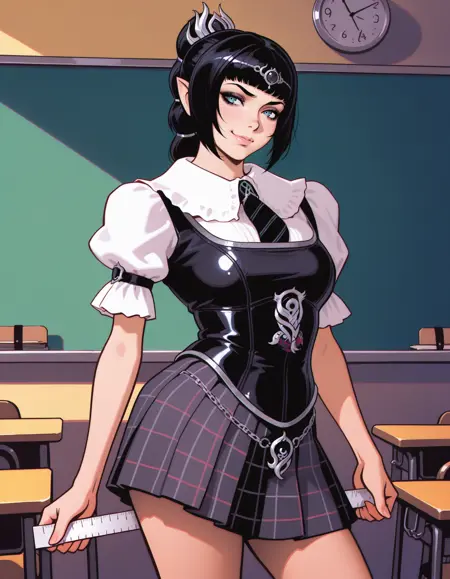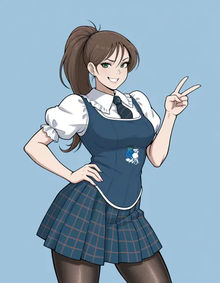 白衬衫,蓝色背心,格子裙,短裙,蕾丝,短泡泡袖,领带,标志