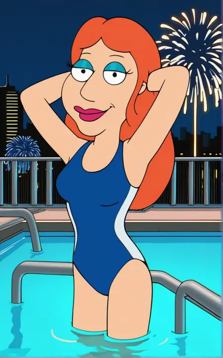 Female_FamilyGuyTV_ownwaifu, flat color, parody, 1girl, breasts, jewelry, makeup, long hair, {swimsuit | lingerie | shirt | dress},