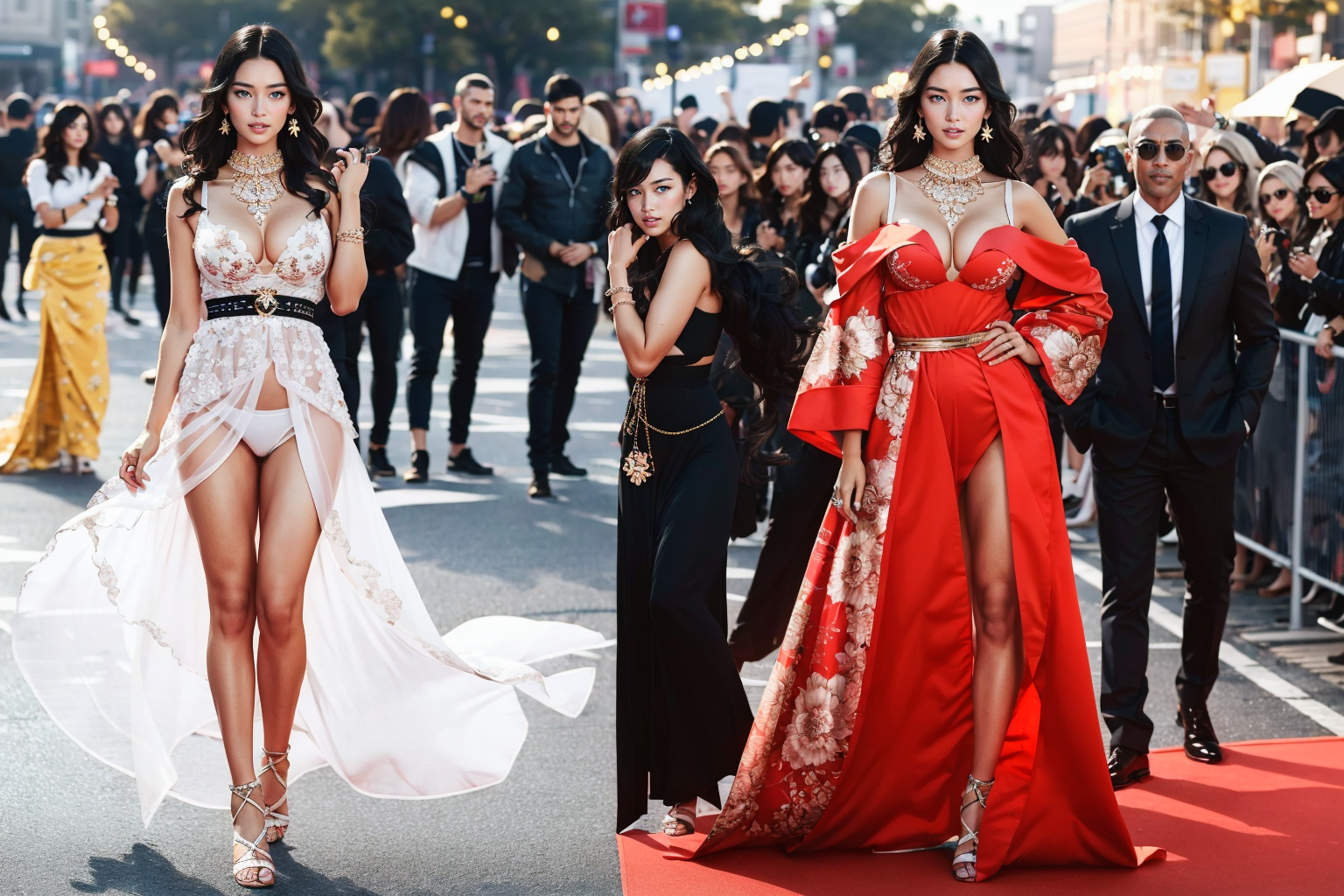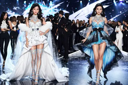 비키토리아의 비밀 스타일을 생성하려면: high heels, necklace, fashion show, victoria's secret, runway, model, stage, stage show 등과 같은 프롬프트를 사용하세요.