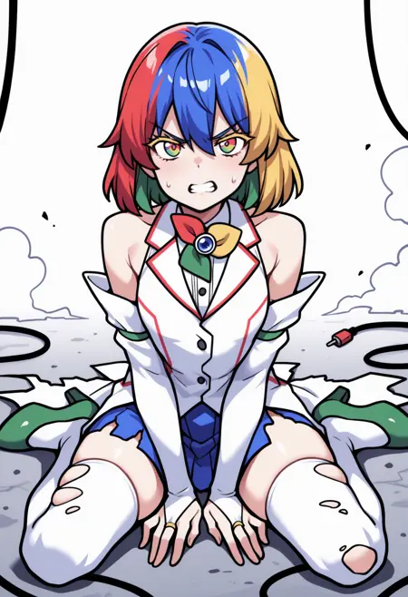 外观: 短发,彩发,彩虹发,红发,金发,蓝发,绿发,彩瞳,渐变瞳色,彩色睫毛