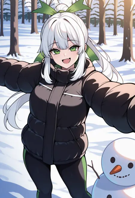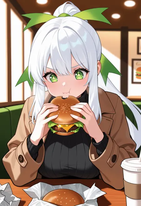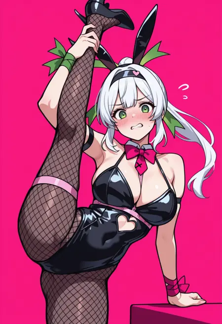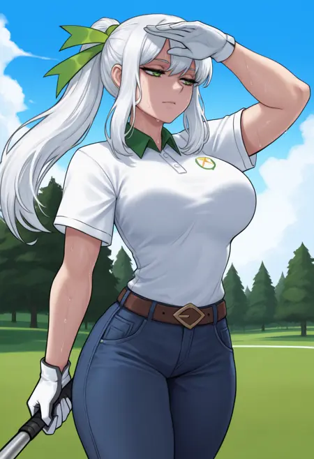 외모: 긴 머리, 흰색 머리, 측면 머리카락, 높은 폴타일, 머리 끈, 녹색 끈, 녹색 눈, 큰 가슴