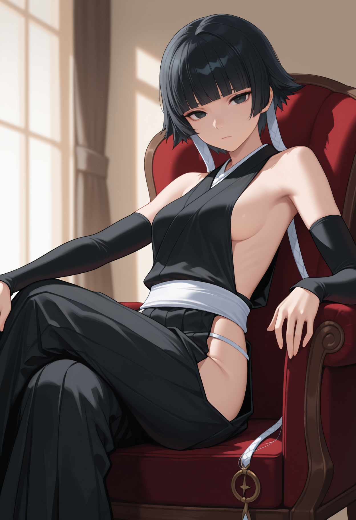默认服装: 和服,无侧边服装,黑色和服,露侧乳,黑色袖子,分离袖子,白色腰带,黑色袴,臀部开衩,裸露肩膀
