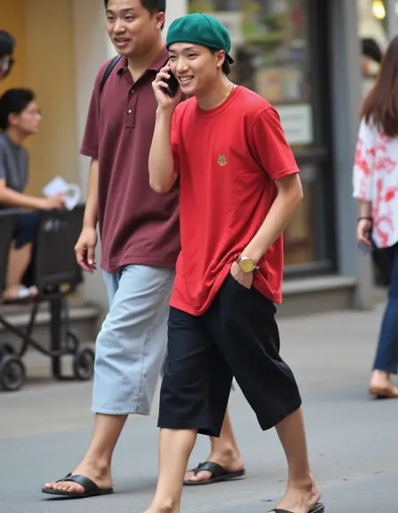 Sample prompt : 9o_korst2_2, 1man walking down street, smile, open_mouth, male focus, (solo:1.2), chic, wear short pants, red tshirts, bare foot, wear green beret, side view, answering phone