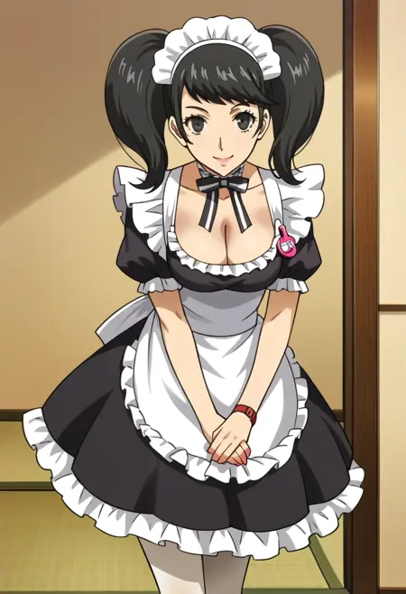 p5kawakami-becky, maid, twintails, pantyhose, white pantyhose, maid headdress, apron, cleavage, pink button badge, wristwatch, red watch strap, mary janes,