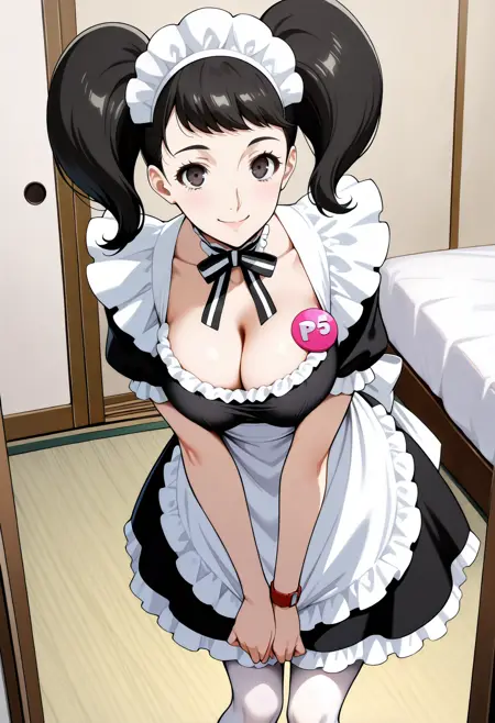 p5kawakami-becky, 女仆, 双马尾, 连裤袜, 白色连裤袜, 女仆头饰, 围裙, 挺胸, 粉色按钮徽章, 手表, 红色表带, 圆头鞋,