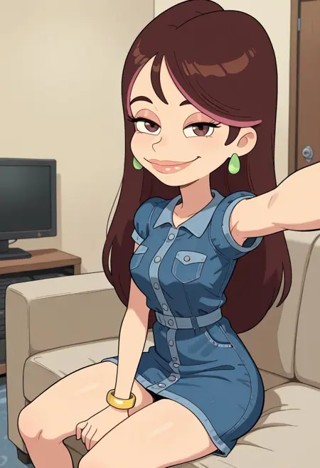 1girl、ソロ、Devin_BM、薄い肌、茶色の目、赤みがかった茶色の髪、赤みがかった茶色の眉、長い髪、緑色の楕円形のイヤリング、ゴールドのブレスレット、ゴールドの指輪、ボタン付きのブルージーンズのドレス、茶色のレースアップ踝ブーツ、大きな目、中程度の身長